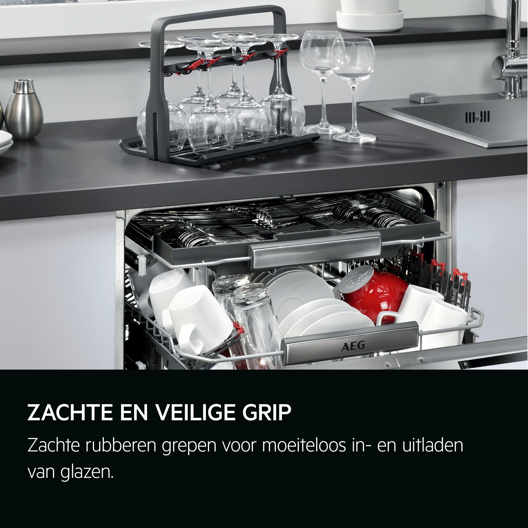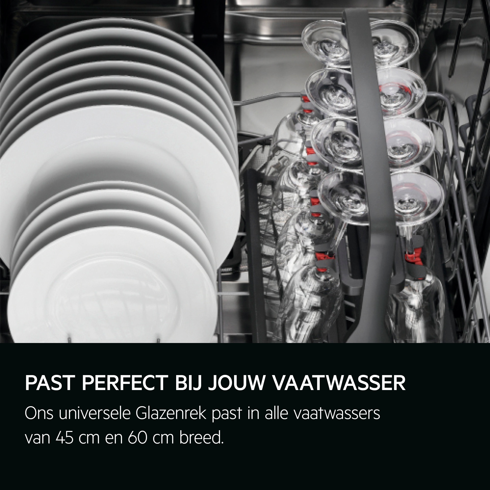 Met het glazenrek van AEG kan je zelfs de meest delicate glazen in je afwasautomaat wassen. Met een grotere capaciteit en flexibiliteit dan in andere systemen in afwasautomaten, houdt het glazenrek tot 8 wijnglazen zacht en stevig vast, en geheel veilig. Je kan mooiste glazen dus zo vaak als je wil gebruiken en wassen. Universele pasvorm voor alle afwasautomaten van 60 en 45 cm, kan platgevouwen worden voor eenvoudige opberging wanneer niet in gebruik.