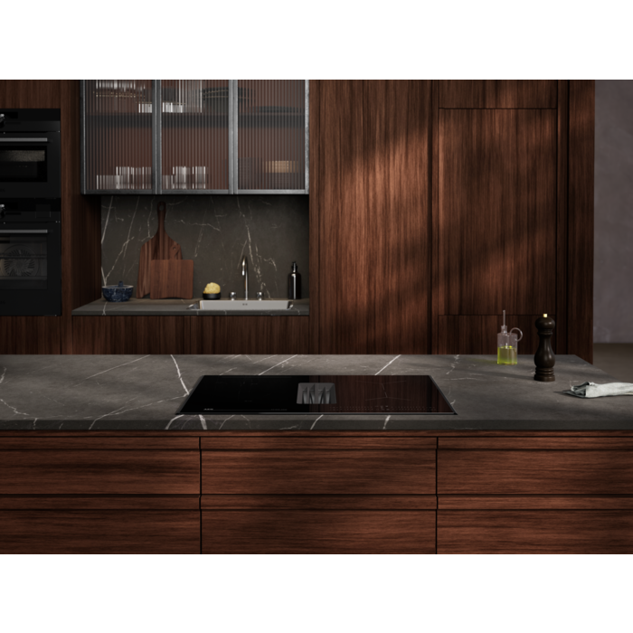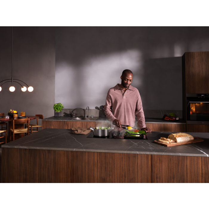 La table de cuisson 6000 avec fonction Bridge combine une plaque à induction qui tient dans une armoire de 60 cm, avec une hotte intégrée puissante pour un flux d’air optimal. Elle dispose également d’une fonction Bridge permettant de combiner deux zones de cuisson en une seule.