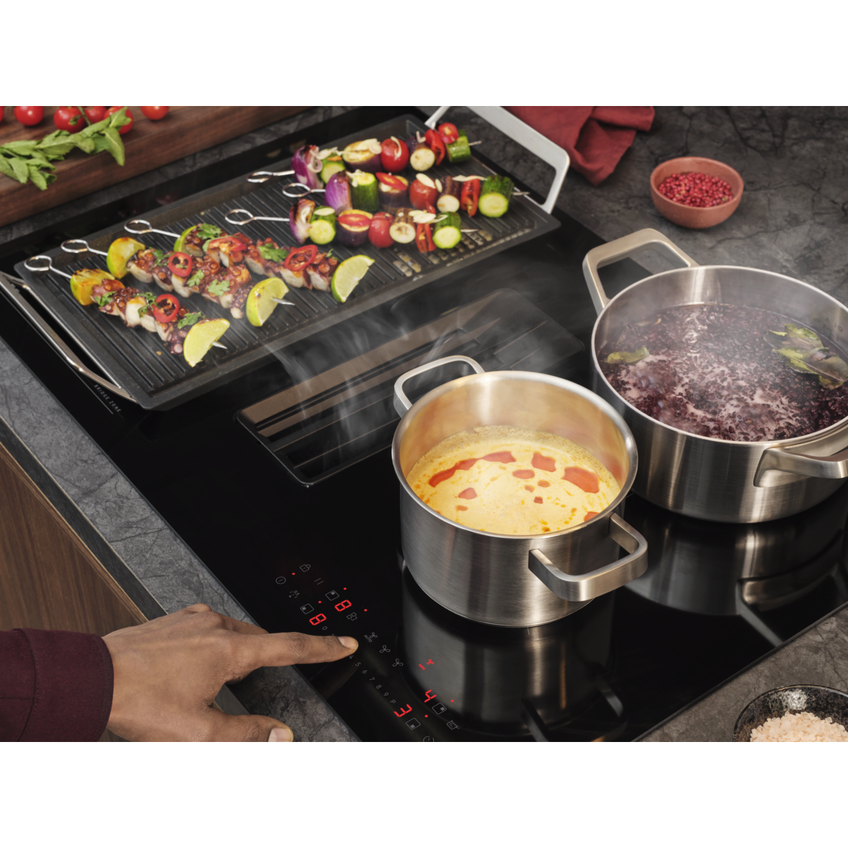 La Bridge 6000 combine une taque à induction pouvant s'intégrer dans un meuble de 60 cm et une hotte intégrée puissante pour une circulation optimale de l'air. Elle dispose d'une fonction Bridge qui vous permet de fusionner 2 zones de cuisson pour des ustensiles de cuisine plus grands.