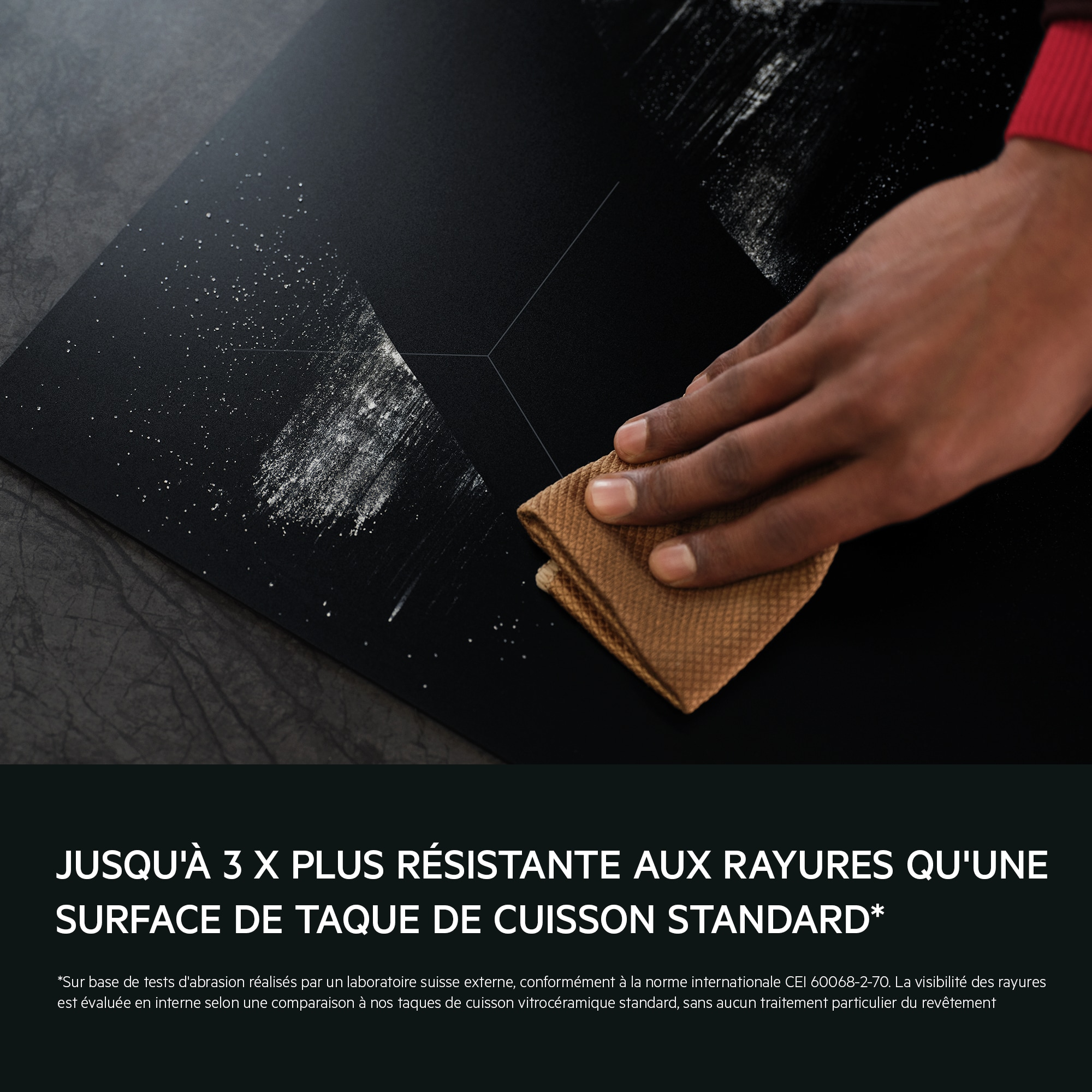 *Sur base de tests de résistance à l'abrasion réalisés par un laboratoire suisse externe, conformément à la norme internationale CEI 60068-2-70. La visibilité des rayures est évaluée en interne, par rapport à nos taques de cuisson en vitrocéramique standard sans traitement, ni revêtement spécial.
