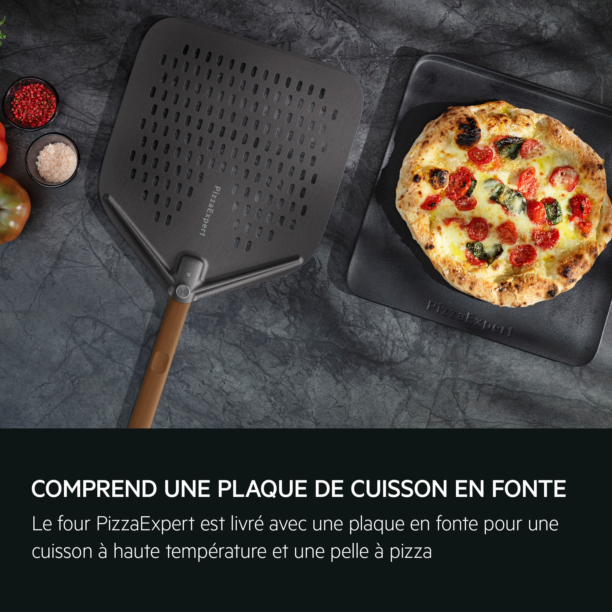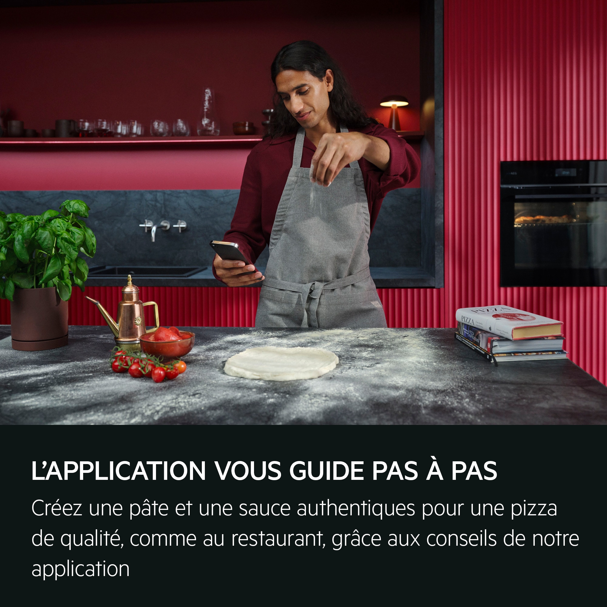 Livré avec un kit pizza : une plaque en fonte et une pelle à pizza perforée.*Sur base de tests internes comprenant 25 minutes de préchauffage et une cuisson à 340 °C, validés par la Scuola Italiana Pizzaioli.