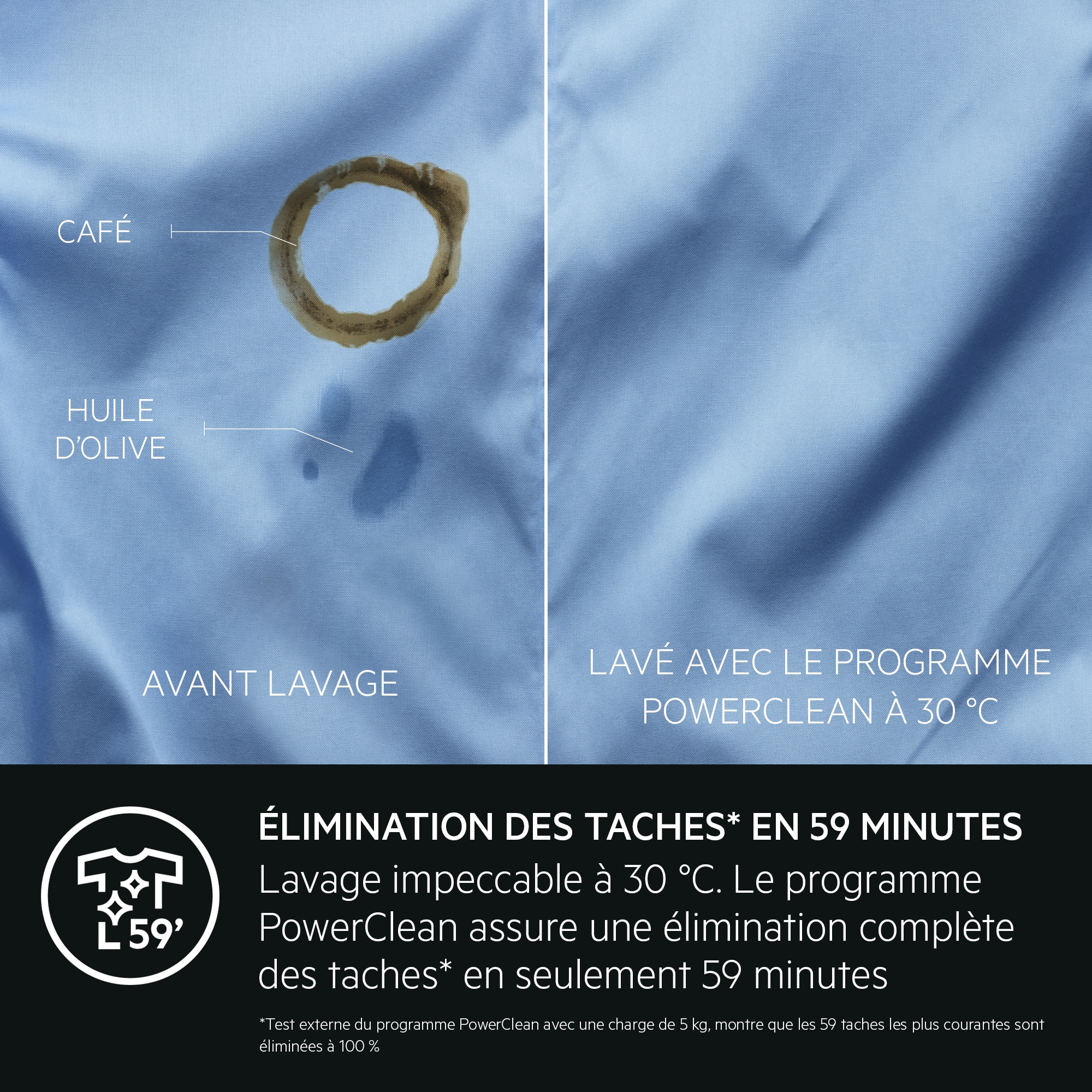 *Un test externe du programme PowerClean 59 min à 30 °C avec une charge de 5 kg montre que les 59 taches les plus courantes sont éliminées à 100 %.