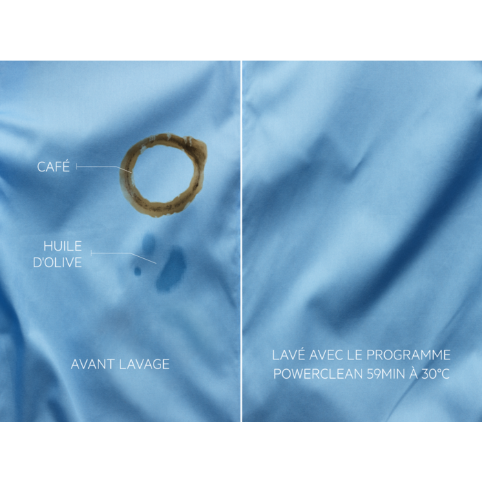 *Un test externe du programme PowerClean 59 min à 30 °C, avec une charge de 5 kg, montre que les 59 taches les plus courantes sont éliminées à 100 %