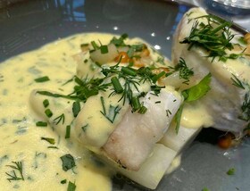Déposez le cabillaud par-dessus et décorez avec quelques croûtons.