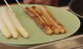 Le chef étoilé et ambassadeur AEG David Martin nous montre avec l’aide de Gaëtan Bartosz la différence entre les asperges vapeur et poêlées.