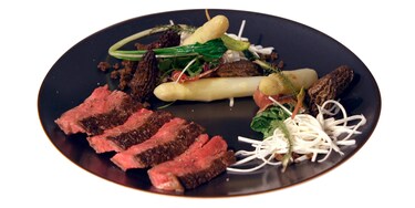 Cuisez les morilles dans la poêle utilisée pour la cuisson de la viande, ajoutez les échalotes émincées, le thym, l’ail jeune, une pincée de sel et de poivre blanc.