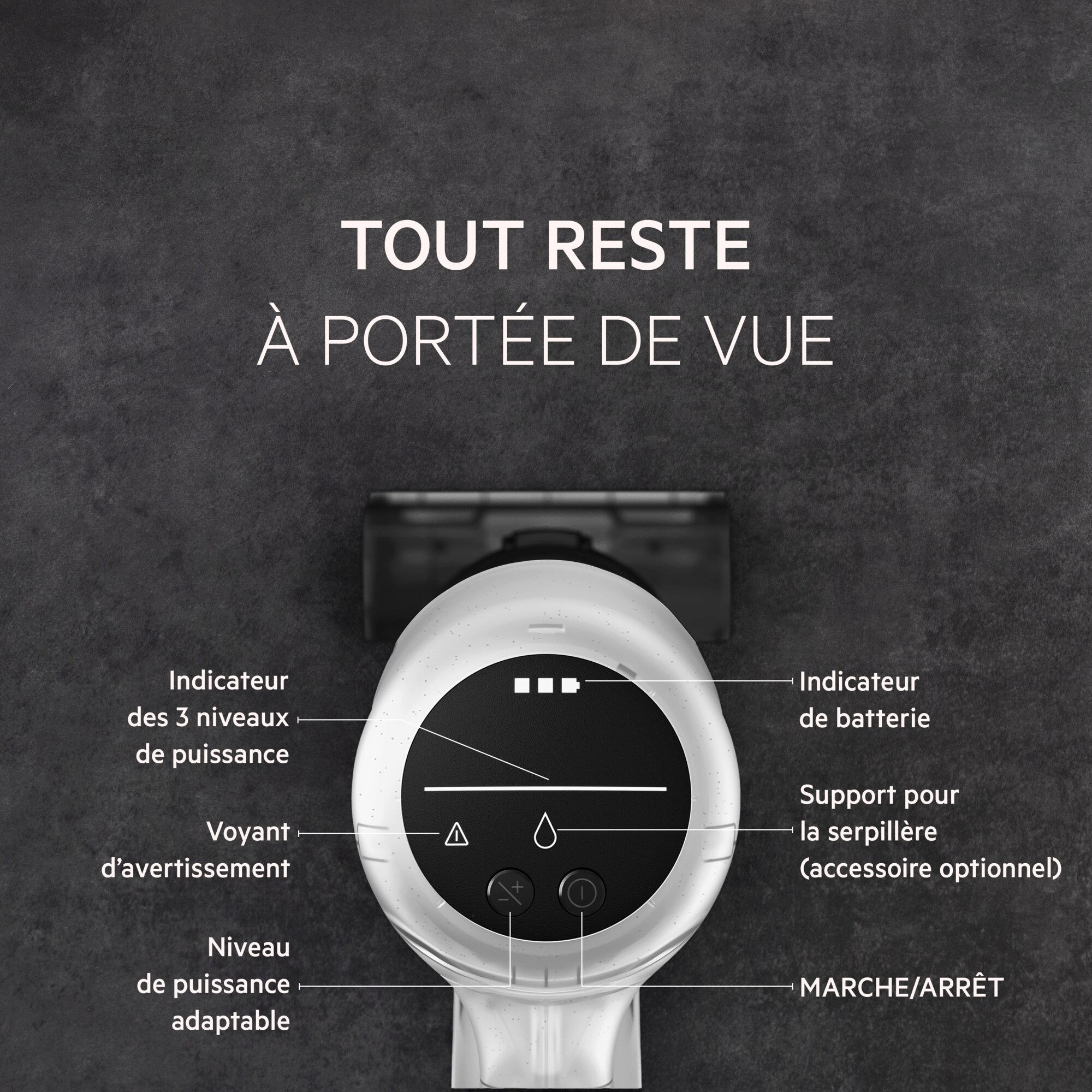 *Mesuré par rapport au précédent aspirateur sans fil 600 avec un bac à poussière chargé de poussière DMT (test standard), selon la norme IEC 62885-4