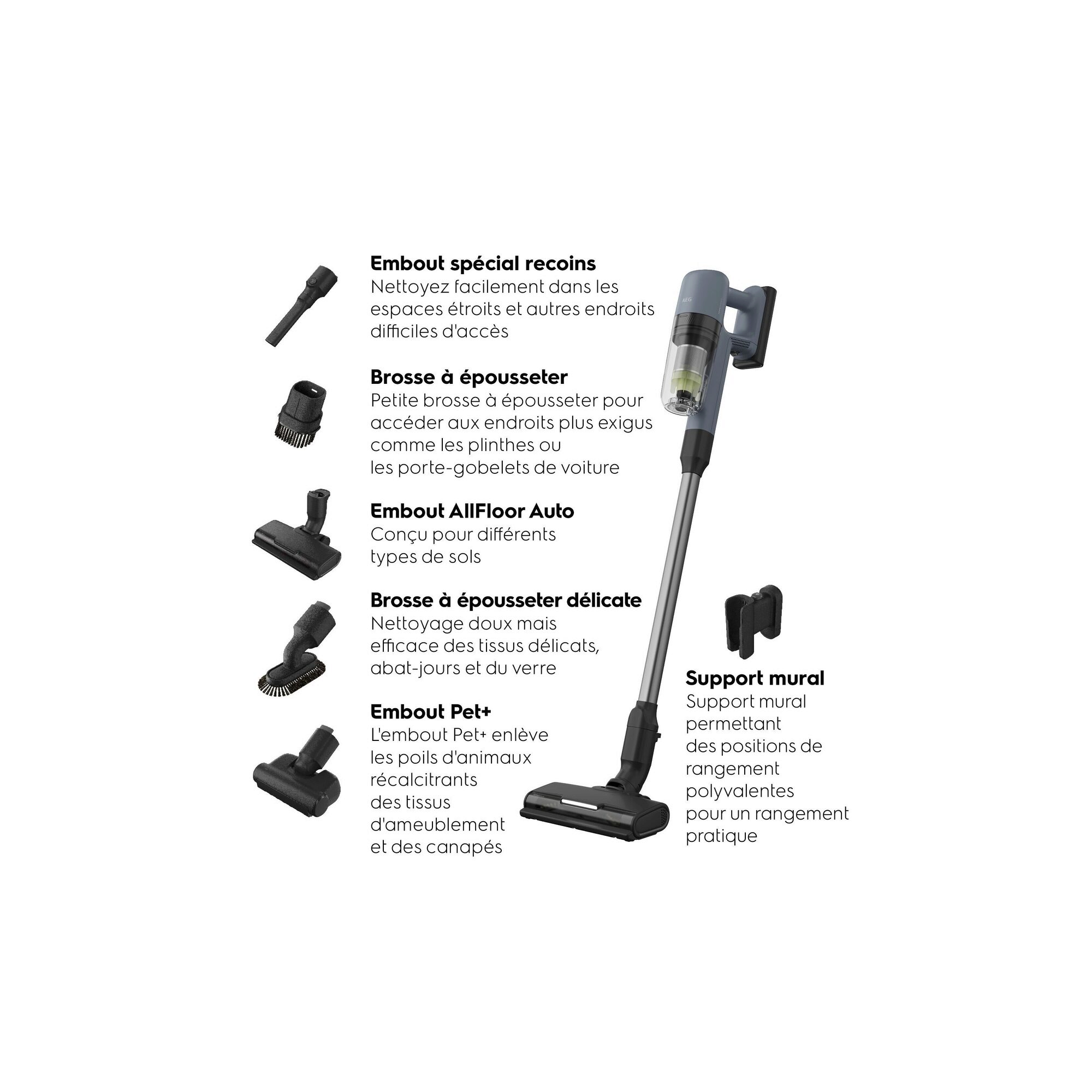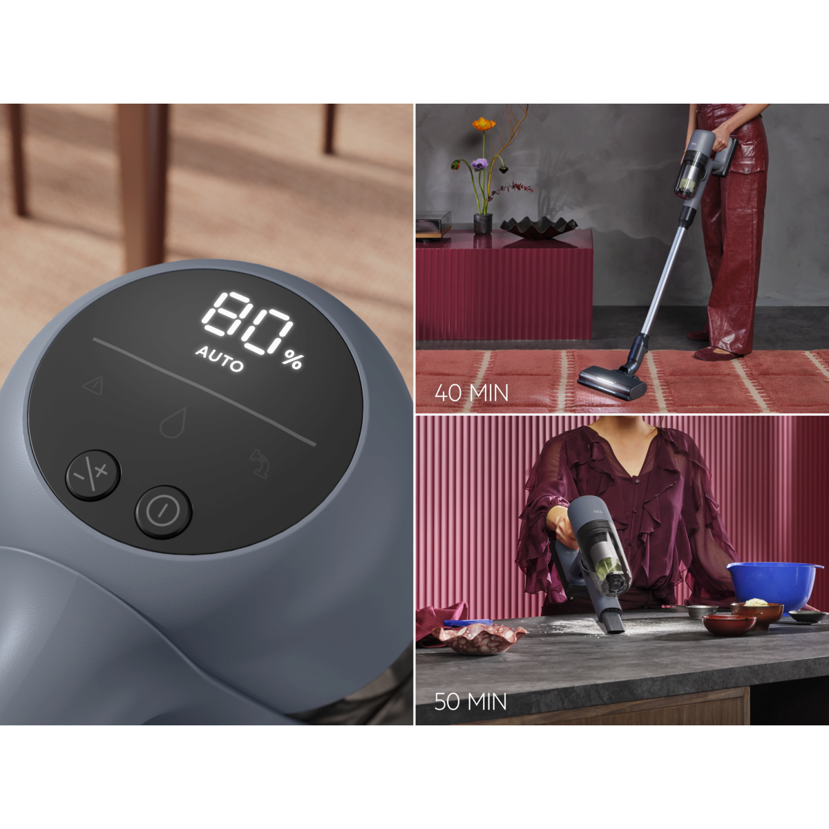 *Comparé à l’autonomie en mode Boost. **Basé sur des tests internes conformément à la norme IEC 62885-4 mesurant l’autonomie de l’unité manuelle et de l’aspirateur complet en mode minimum. ***Surface nettoyée basée sur un test interne utilisant un double passage à une vitesse de 0,5 m/s.