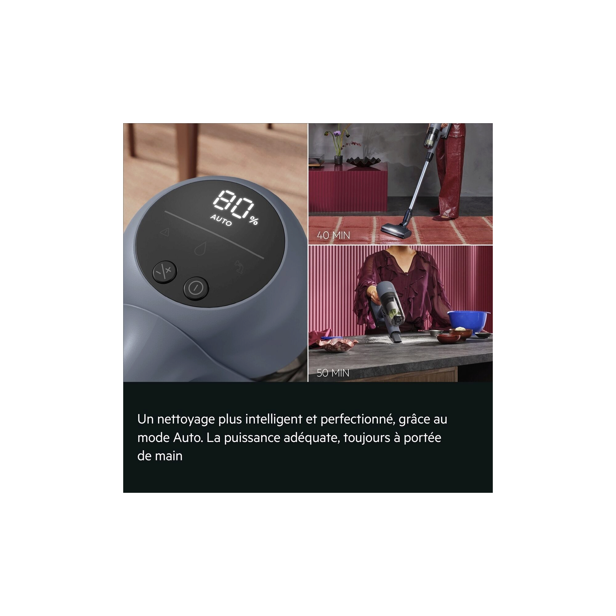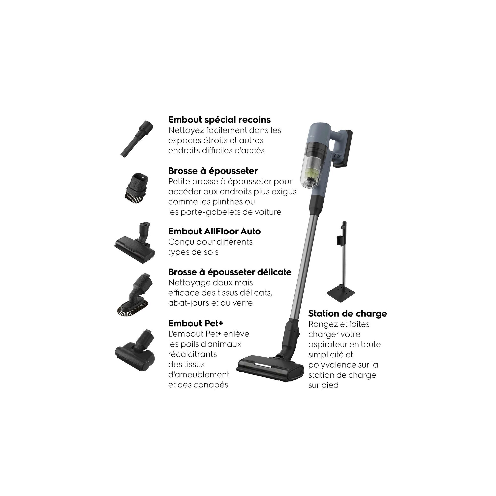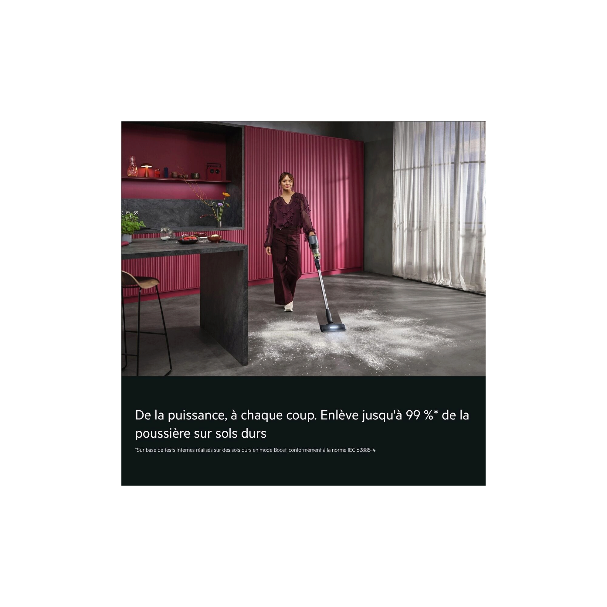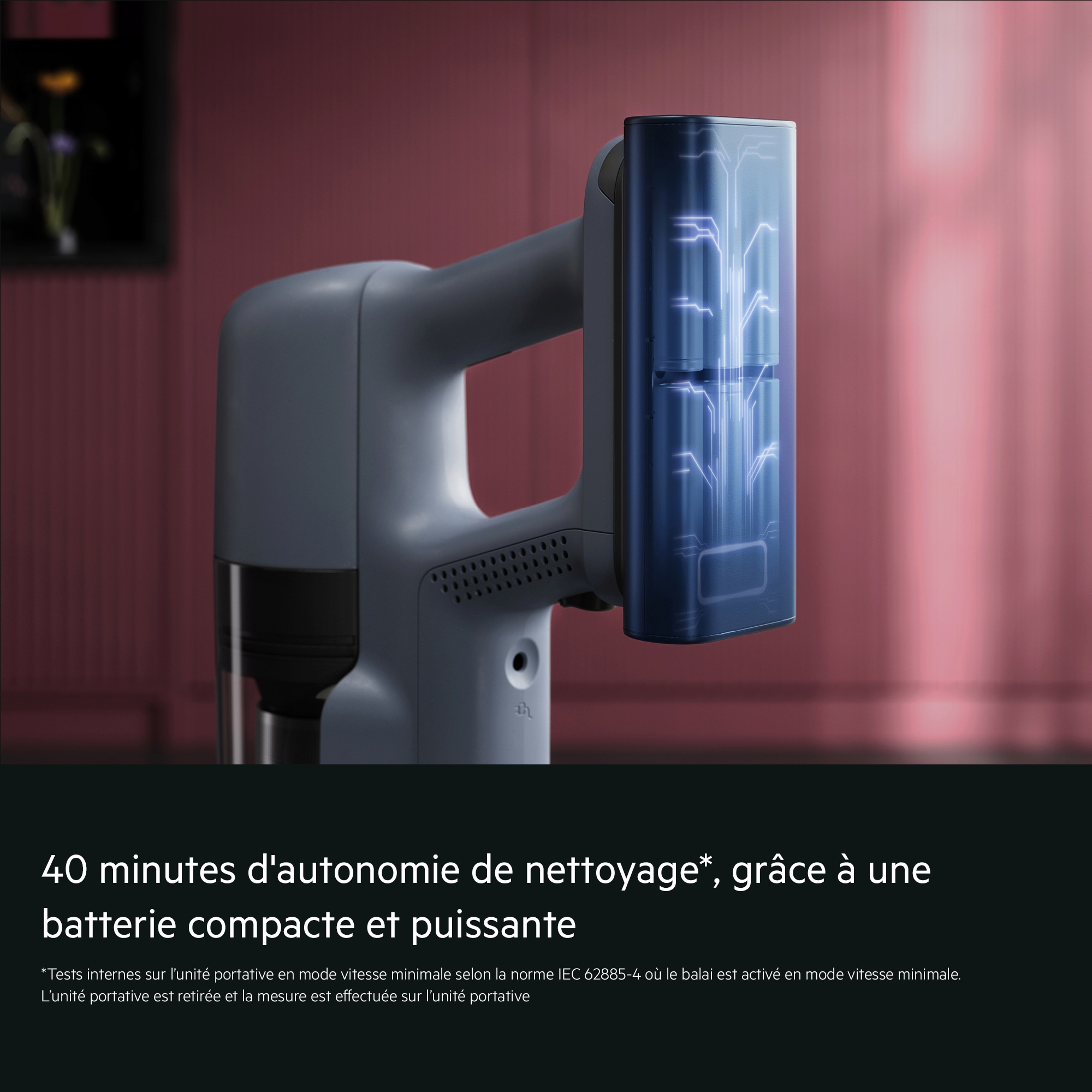 *Comparé à l’autonomie en mode Boost. **Basé sur des tests internes conformément à la norme IEC 62885-4 mesurant l’autonomie de l’unité manuelle et de l’aspirateur complet en mode minimum. ***Surface nettoyée basée sur un test interne utilisant un double passage à une vitesse de 0,5 m/s.