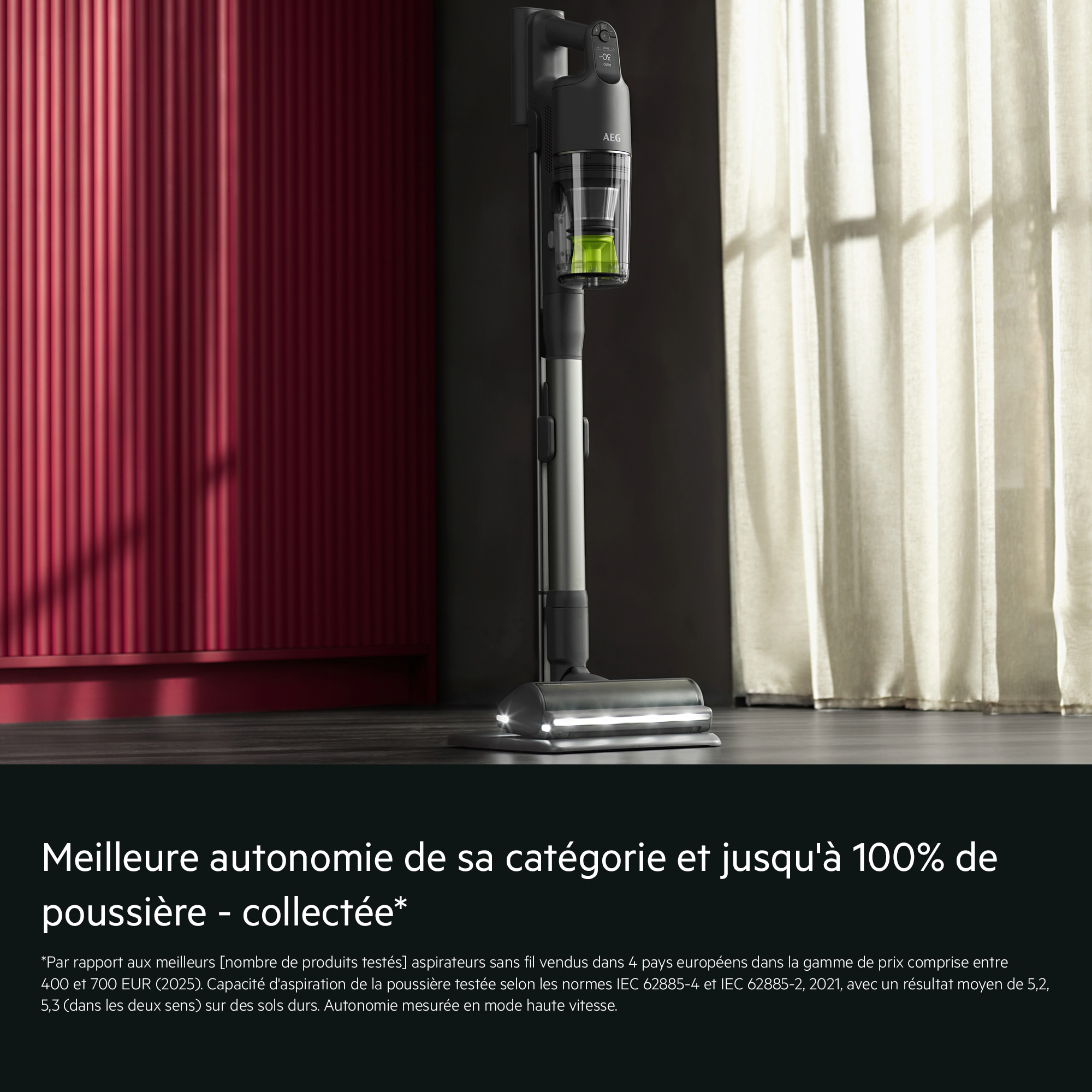 *Par rapport aux [nombre de produits testés] aspirateurs sans fil les plus vendus dans 4 pays européens entre 400 et 700 € (2025). Capacité d'aspiration selon les normes IEC 62885-4 et IEC 62885-2, 2021, avec résultat moyen de 5,2, 5,3 (dans les 2 sens) sur sols durs. Mesurée en mode haute vitesse.