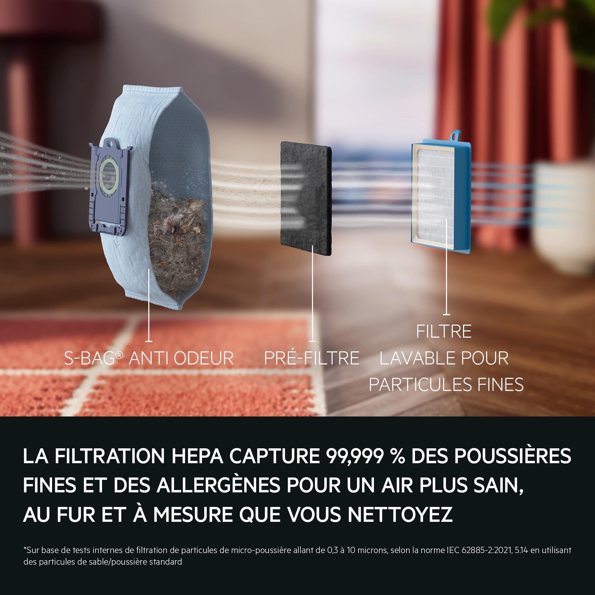 *Sur base de tests internes de filtration de particules de micro-poussière allant de 0,3 à 10 microns, selon la norme IEC 62885-2:2021, 5.14 en utilisant des particules de sable/poussière standard.