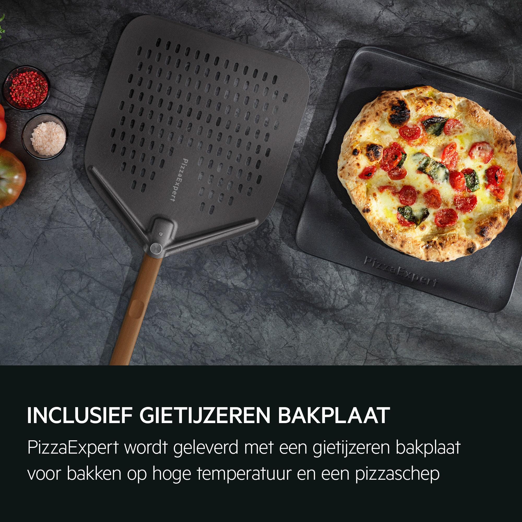 Wordt geleverd met bijbehorende pizzakit: een gietijzeren bakplaat en geperforeerde pizzaschep.