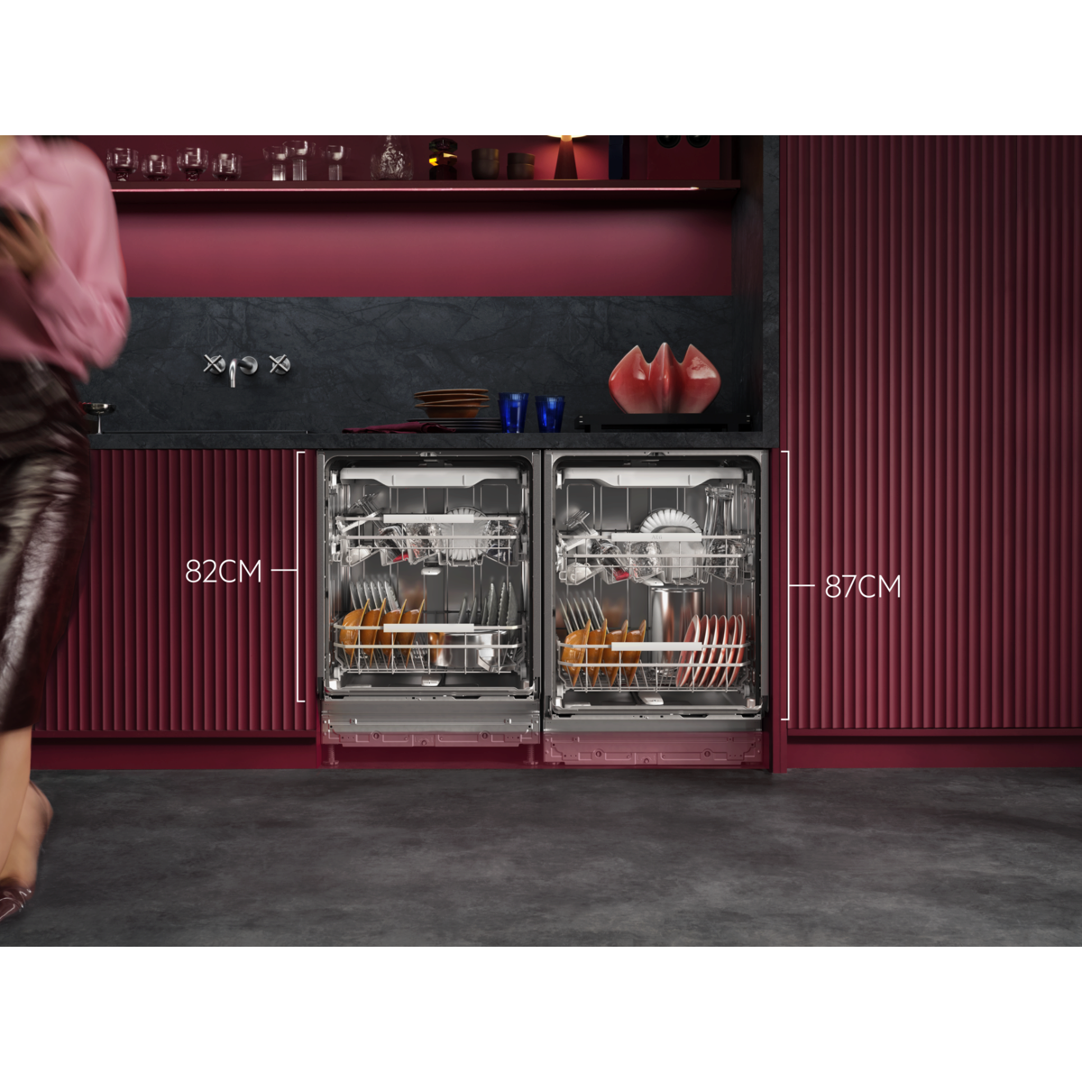 Reinig moeiteloos grote items zoals pizzaborden, hoge bierglazen of karaffen in onze XXL Max-modellen, zonder extra water of energie te gebruiken. Dankzij 5 cm extra binnenruimte en een lagere installatiehoogte past hij perfect onder een standaard aanrecht van 90 cm.