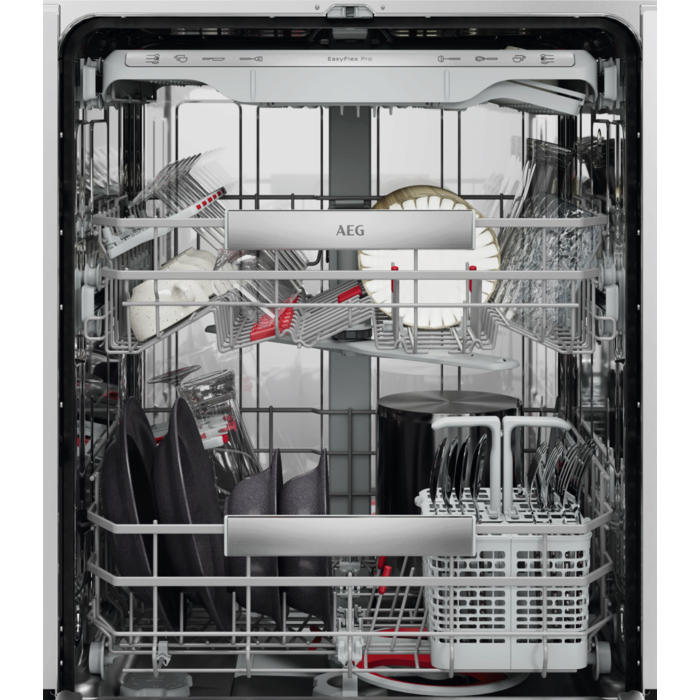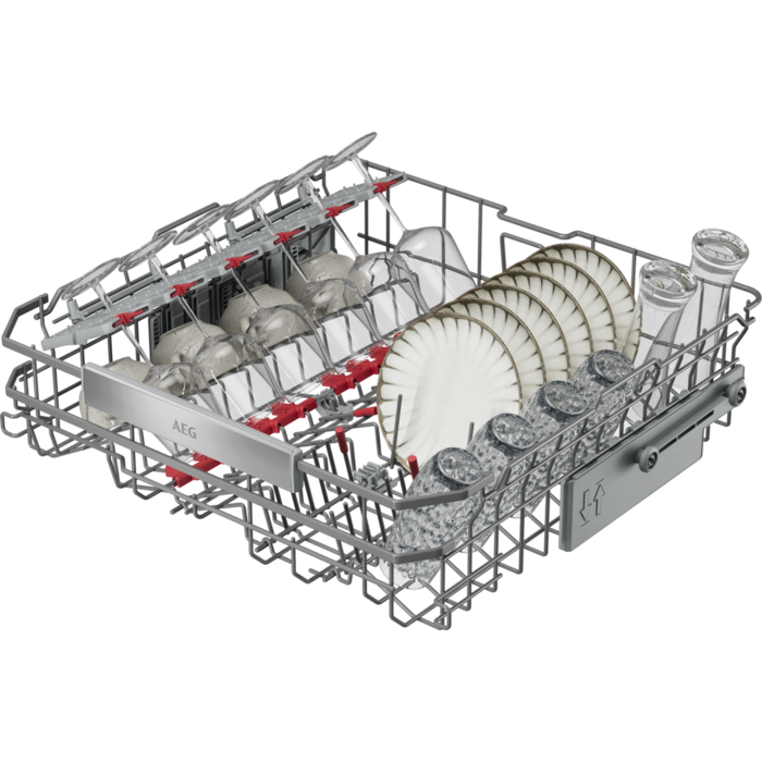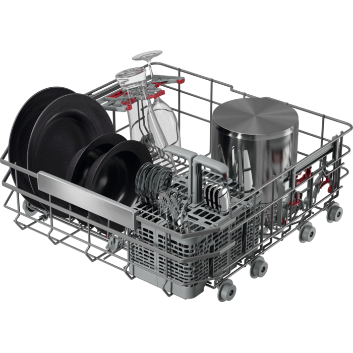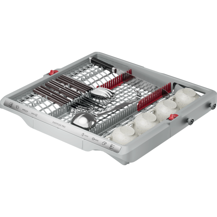 De EasyFlex Pro-korven glijden soepel en zijn volledig inklapbaar voor maximale flexibiliteit. Antislip rubberen houders en noppen houden glazen en wijnglazen stevig op hun plek en voorkomen botsingen. De besteklade biedt ruimte voor kloppers, soeplepels en kleine kopjes.