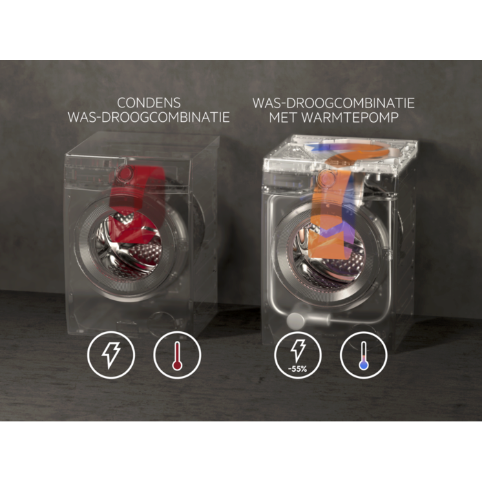 *Gebaseerd op interne vergelijkende testen van de maximale luchttemperatuur bij de inlaat naar de trommel van warmtepomp- en traditionele condenswas-droogcombinaties