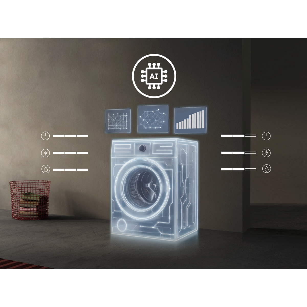 *Gebaseerd op een vooraf getraind beladingsherkenningalgoritme. Er worden geen gebruikersgegevens gebruikt om de AI verder te trainen. ** Interne test van tijd-, water- en energieverbruik voor een katoenprogramma op 30°C, geoptimaliseerd met AI WashAssist voor 1 kg versus maximale belading.