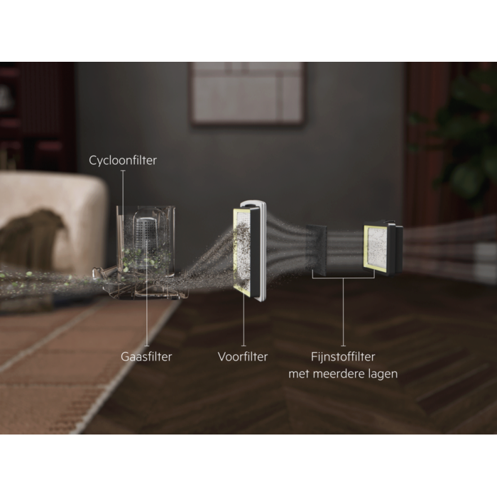 *Gebaseerd op interne tests op filtratie van microstofdeeltjes met een grootte van 0,3-10 micron op basis van standaard IEC62885-2:2021, 5.14 met gebruik van standaard zand-/stofdeeltjes.