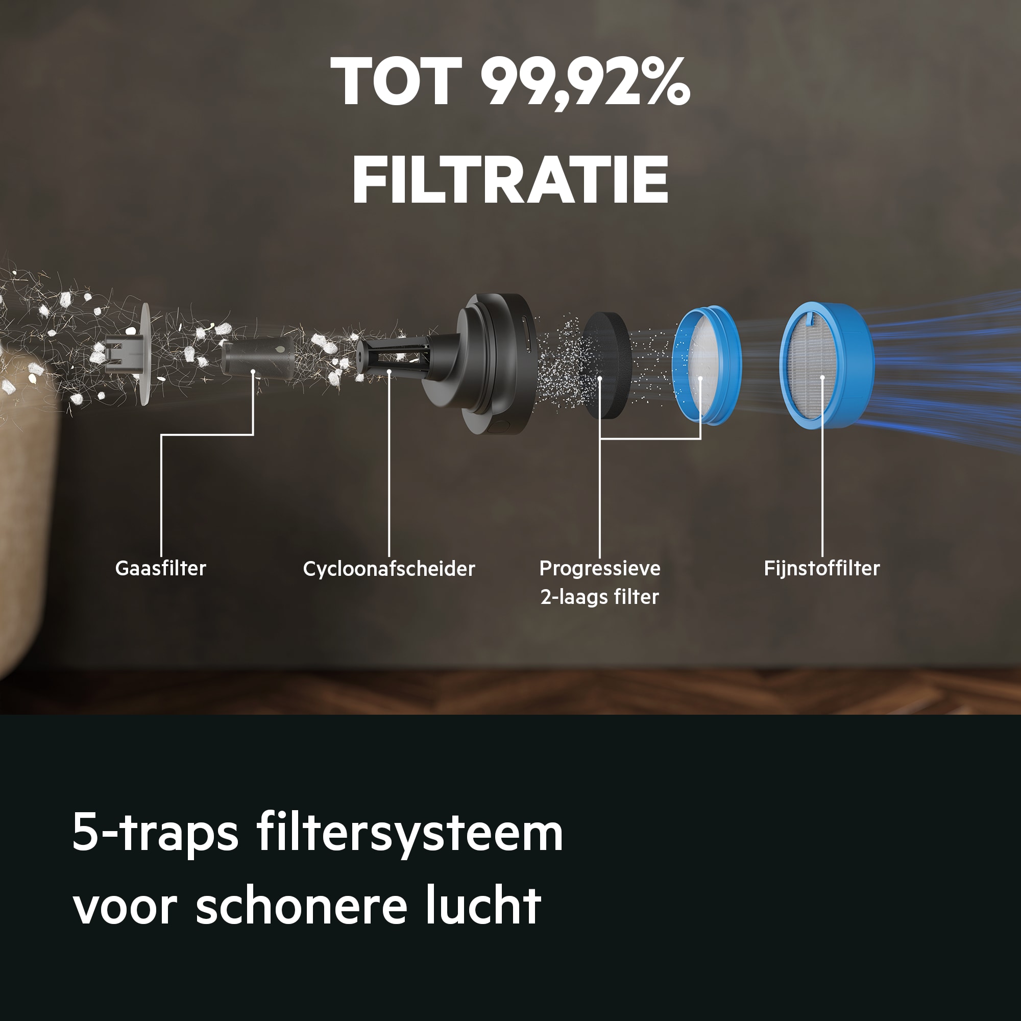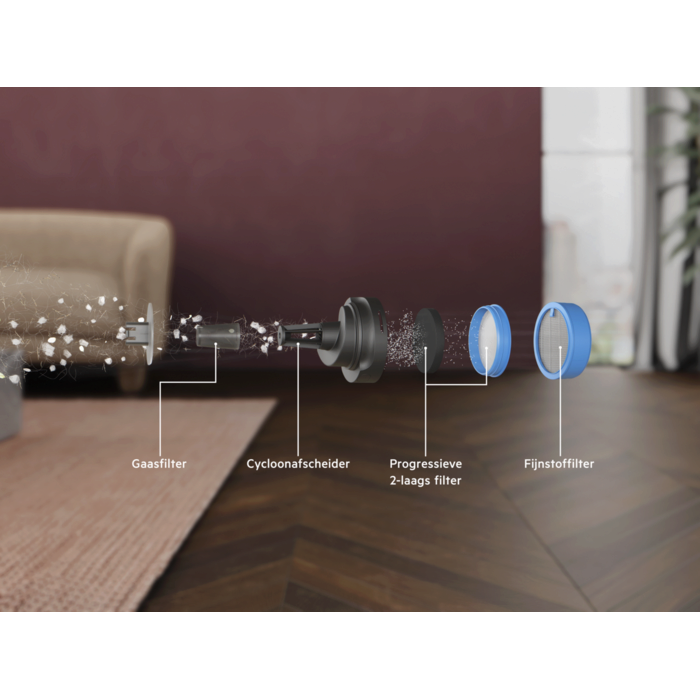 De verbeterde cyclonische afscheider biedt ongeëvenaarde zuigprestaties. Door de stofdeeltjes efficiënt te scheiden, komt er meer stof in de vuilnisbak terecht en gaat de filter 2 keer langer* mee voordat hij vervangen moet worden.