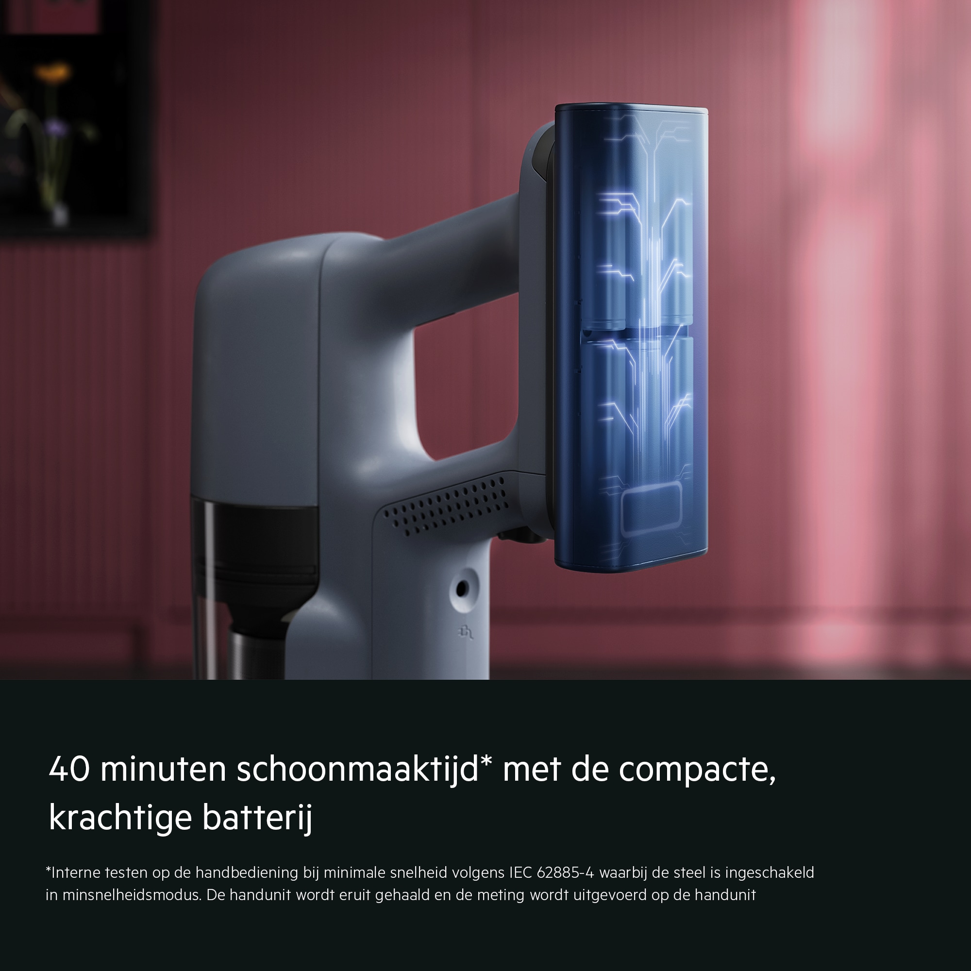 *In vergelijking met de gebruiksduur in Boost-modus. **Gebaseerd op interne tests volgens IEC 62885-4, gemeten in de minimumstand bij gebruik van de handunit en volledige stofzuiger. ***Reinigingsbereik gebaseerd op interne test met dubbele beweging per oppervlak bij 0,5 m/s.