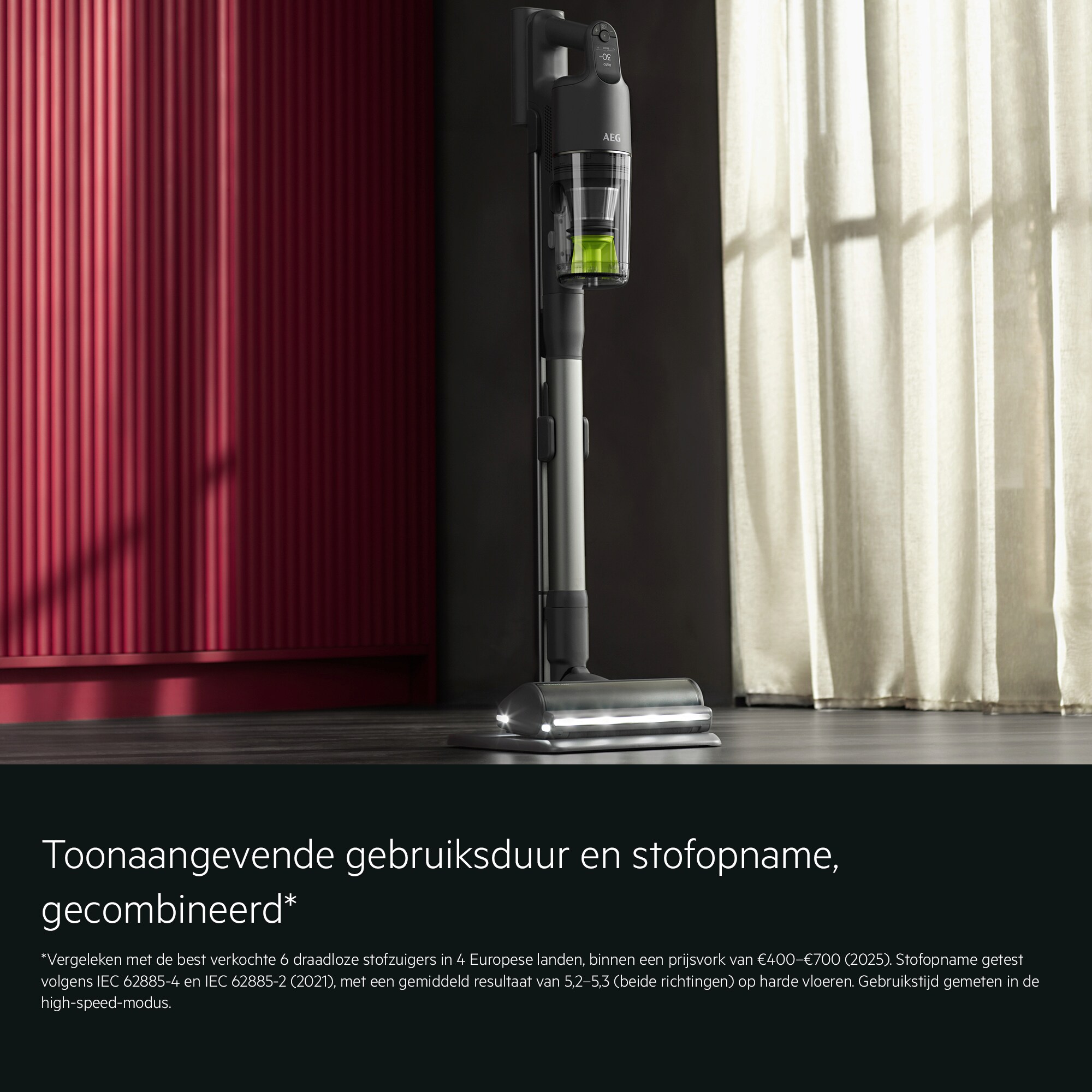 *Gebaseerd op tests volgens IEC 62885-2 met gemiddelde stofopnameresultaten 5.2 en 5.3 (beide richtingen) op harde vloeren. Vergelijking met 6 bestverkochte draadloze stofzuigers boven €490 in 4 Europese landen (oktober 2024 – september 2025). ** Registreer je toestel binnen 90 dagen na aankoop om je AEG-motorgarantie van 10 jaar te activeren. Algemene voorwaarden gelden. Zie www.aeg.com