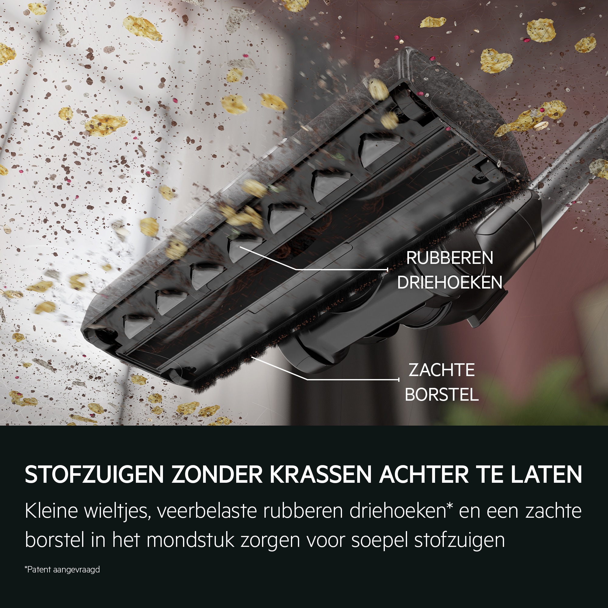 Het AllFloor Auto LED-mondstuk met innovatieve rubberen driehoeken* en zachte borstel tilt stofzuigen naar een hoger niveau. Maak elk oppervlak efficiënt schoon, van tapijten tot harde vloeren, met 100%** stofopname in spleten.