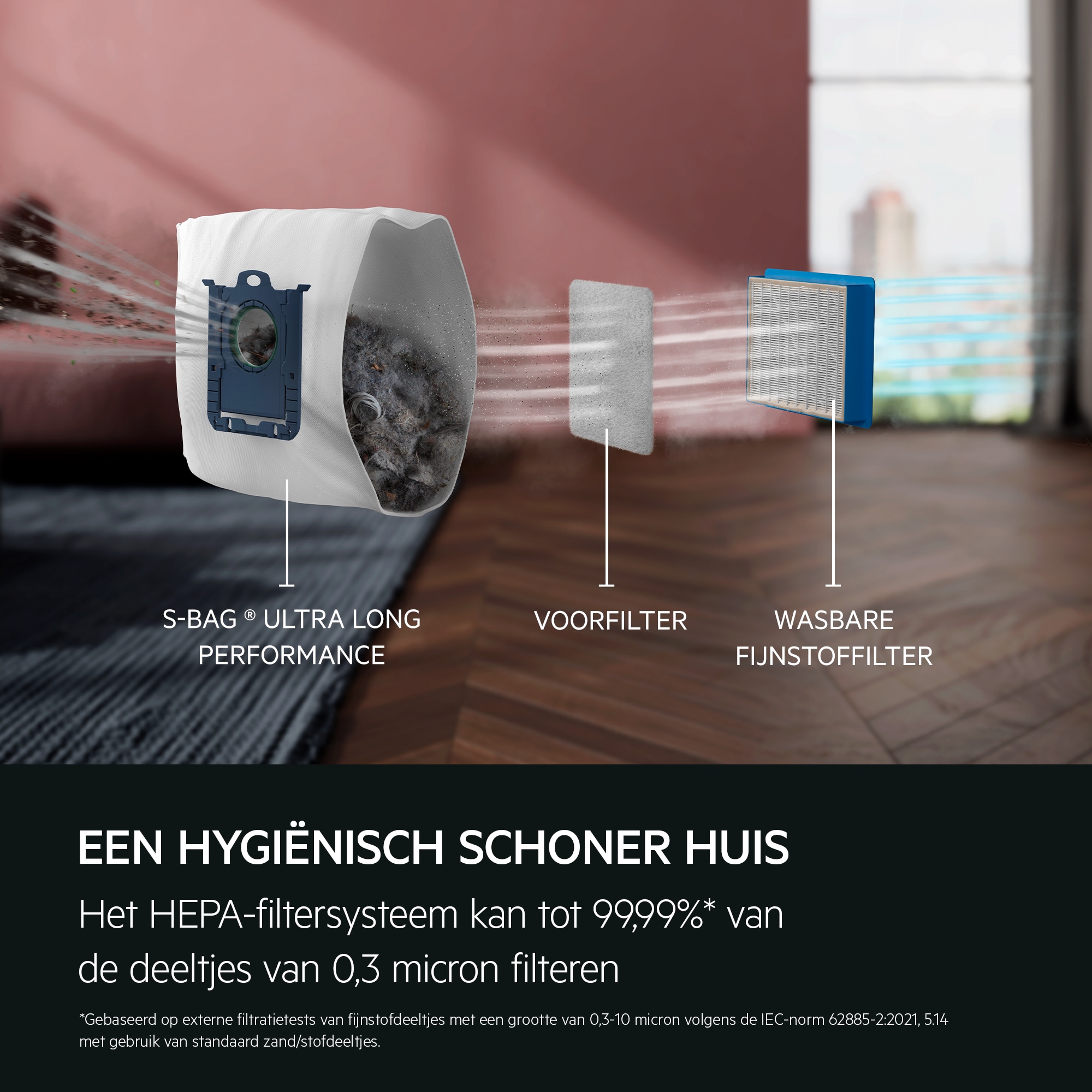 *Gebaseerd op externe tests op filtratie van microstofdeeltjes met een grootte van 0,3-10 micron op basis van standaard IEC62885-2:2021, 5.14 met gebruik van standaard zand-/stofdeeltjes.