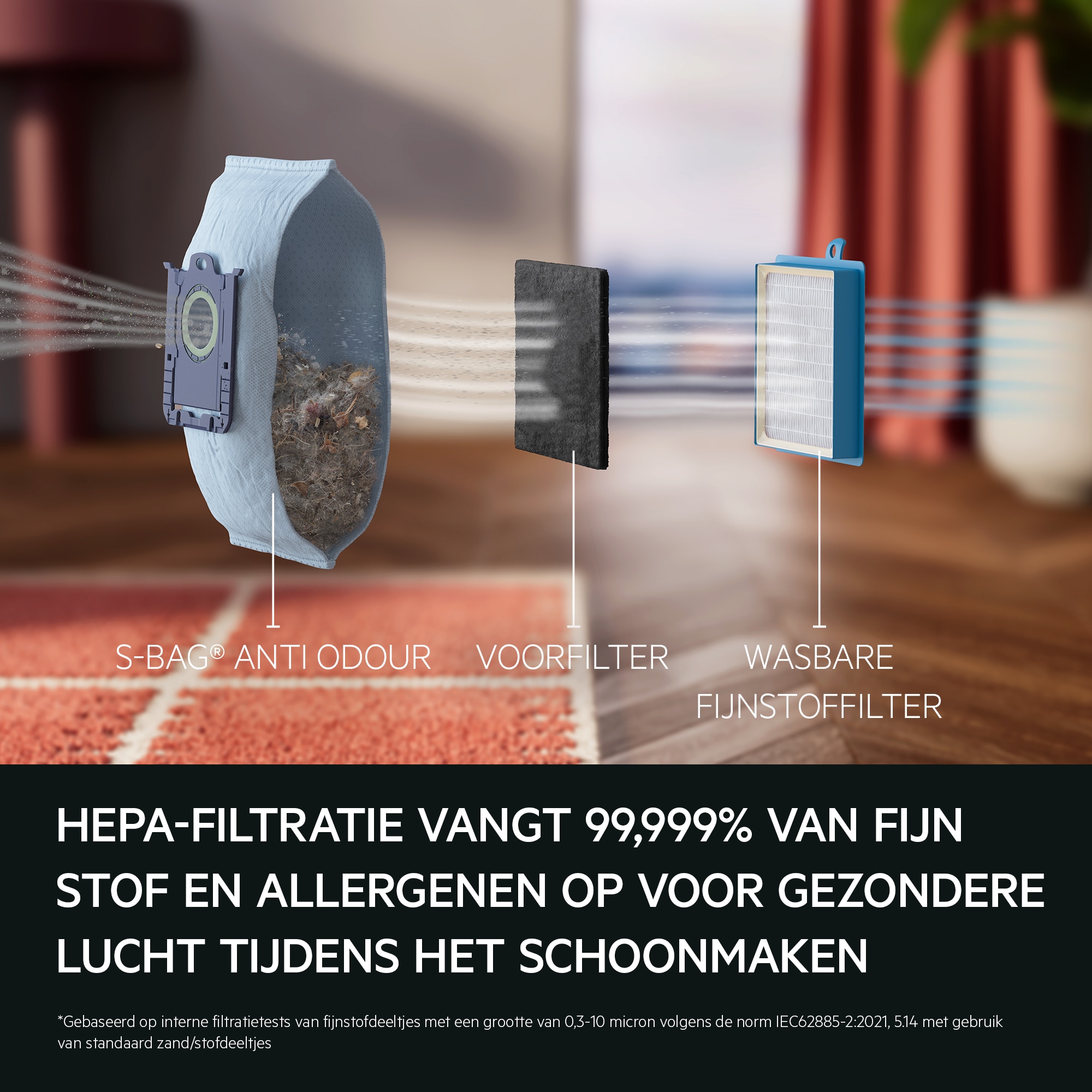 *Gebaseerd op interne filtratietests van fijnstofdeeltjes met een grootte van 0,3-10 micron volgens de norm IEC62885-2:2021, 5.14 met gebruik van standaard zand/stofdeeltjes.
